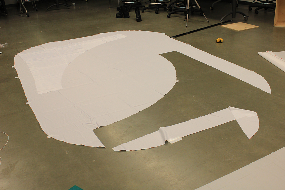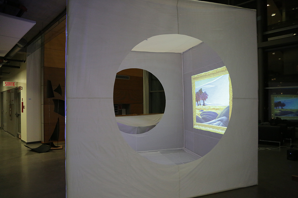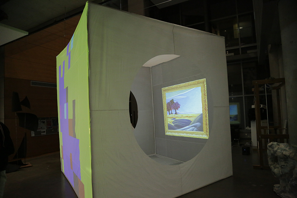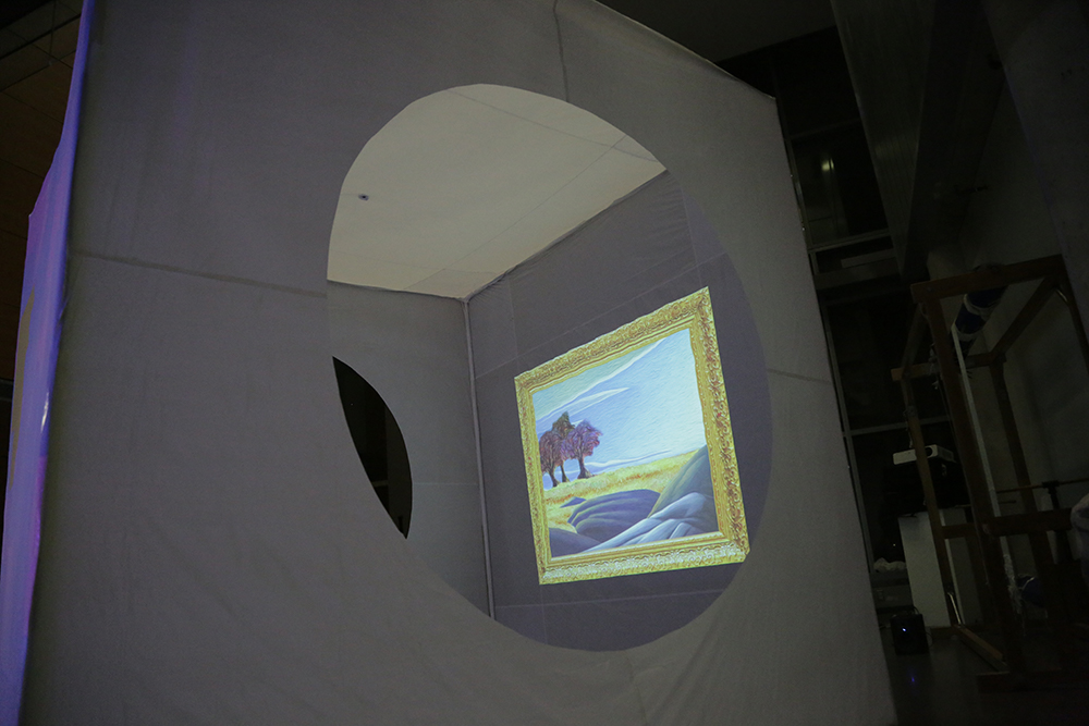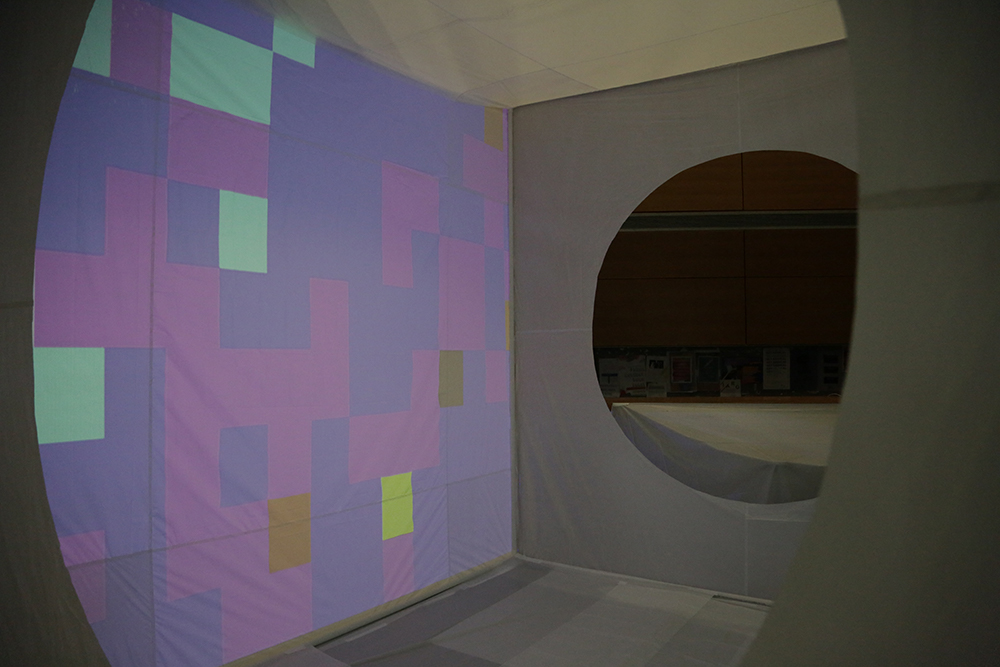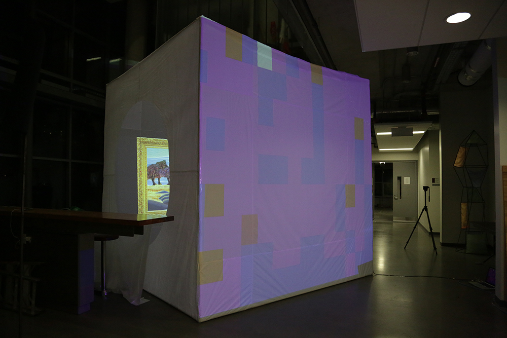 The projection maps and entry ways made of shower curtain liner are stuck to the structure with tape.